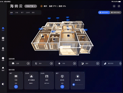 在科技系统方面,海尚府以海纳云AIoT物联平台为核,使用行业内首创的HIM(家庭信息模型)平台,通过数字孪生三维建模,还原户型结构,可视化管理户内的水电暖隐蔽管线,让检修和操控更加直观、便捷;可实现远程控制、手机控制智能窗帘、智能梯控、智慧照明、智慧地暖、智慧用水、智慧用电等;打通社区服务,实现远程呼梯,呼叫物业服务,安全、智慧、便捷生活,快人一步。
