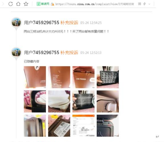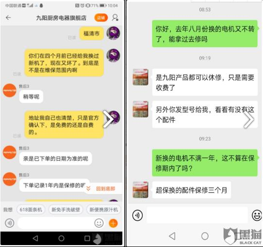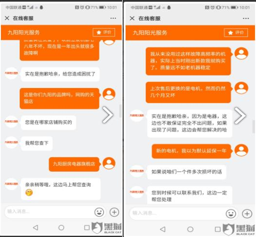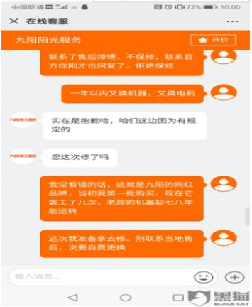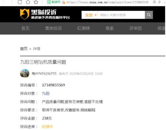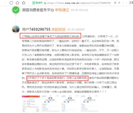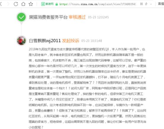 5月23日,名为“白雪飘飘wj2011”的用户在黑猫投诉上发布“九阳豆浆机网红产品高故障率质量严重问题,第一批用户做了小白鼠,被售后拒绝保修!!”投诉帖。