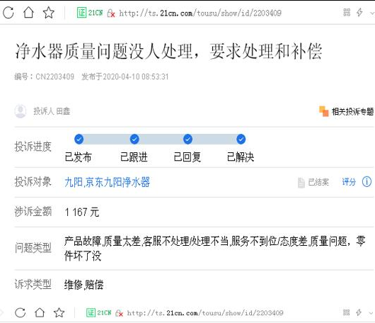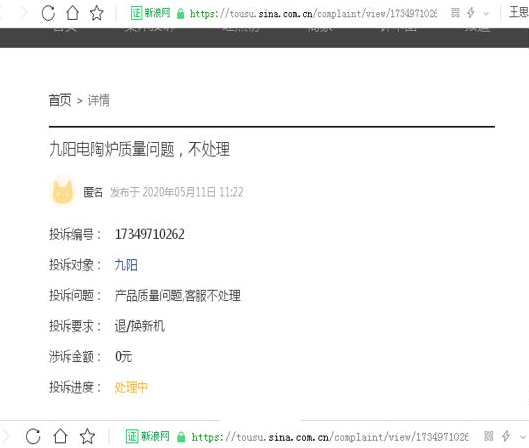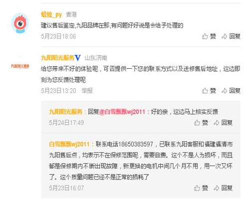 和讯网注意到,该贴发出后,九阳阳关服务于5月23日13:20回复表示反馈处理。不过截至5月25日发稿,该投诉贴尚未见进一步处理信息显示。