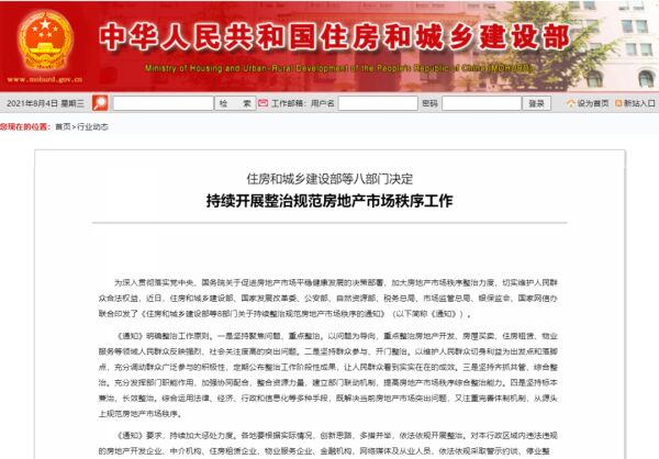 2021年8月4日,住房和城乡建设部、国家发展改革委等8部门联合印发《关于持续整治规范房地产市场秩序的通知》提出,力争用3年左右时间,实现房地产市场秩序明显好转。