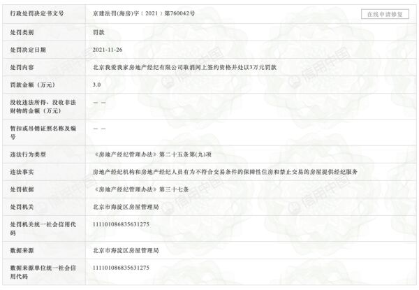 打开11月26日,北京我爱我家房地产经纪有限公司新增行政处罚,违法事实为房地产经纪机构和房地产经纪人员有为不符合交易条件的保障性住房和禁止交易的房屋提供经纪服务,处罚结果为取消网上签约资格并罚款3万元,处罚单位为北京市海淀区房屋管理局。