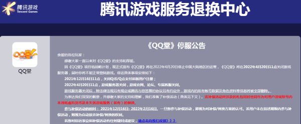 打开12月16日,腾讯游戏《QQ堂》发布停运公告,因《QQ堂》项目组战略计划,正式宣布《QQ堂》将在2022年4月20日停止中国大陆地区的运营。《QQ堂》将在2022年4月20日11点关闭游戏服务器,届时玩家将不能正常登陆游戏。该游戏已上线17年。
