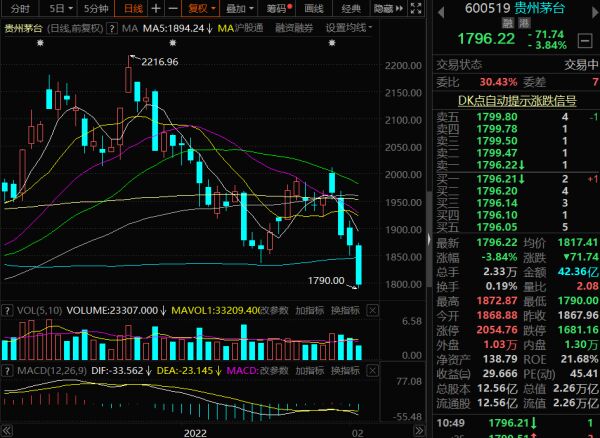 打开2月8日,股王贵州茅台的下跌势头还在继续,股价跌破1800元关口,截至记者发稿时,贵州茅台跌3.84%,报1796.22元。