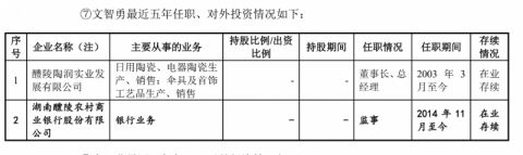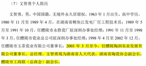 以及当时以2.5元/注册资本受让了郭敏转让的6.25万出资份额的文智勇。招股书显示,文智勇为湖南省人大代表,湖南省陶瓷协会副会长,醴陵市工商联(总商会)副会长。同时,文智勇从2014年11月至今还在湖南醴陵农村商业银行股份有限公司担任监事,从事银行业务。
