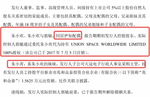 值得注意的是,在恒茂高科的招股书中,公司称关系方朱小欢为“与郭敏同居俨如配偶”。至于“前妻”,则表示其与郭敏“已经在报告期外解除婚姻关系”。