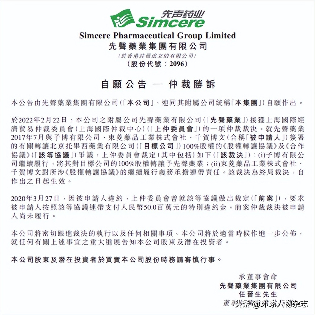 近日,先声药业发布公告称,在收购托毕西药业100%股权的纠纷中仲裁胜诉,托毕西药业100%股权转让予先声药业。