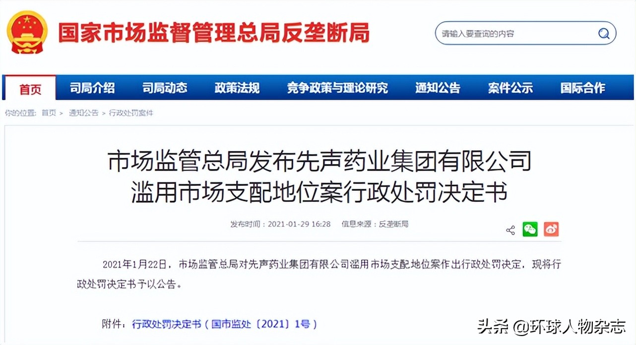 2020年9月起,先声药业因涉嫌实施滥用市场支配地位行为受到调查。2021年1月22日,市场监管总局便发布了处罚决定书。