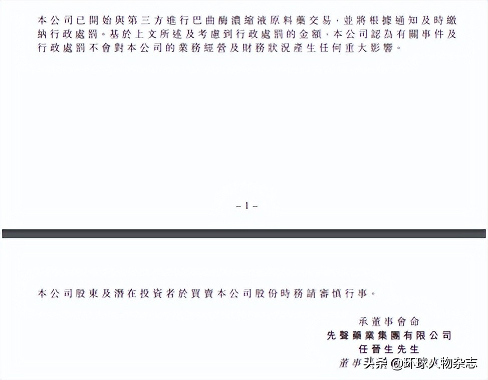 先声药业称,“本公司认为有关事件及行政处罚不会对本公司的业务经营及财务状况产生任何重大影响。”下方落款处,是先声药业集团董事长任晋生。
