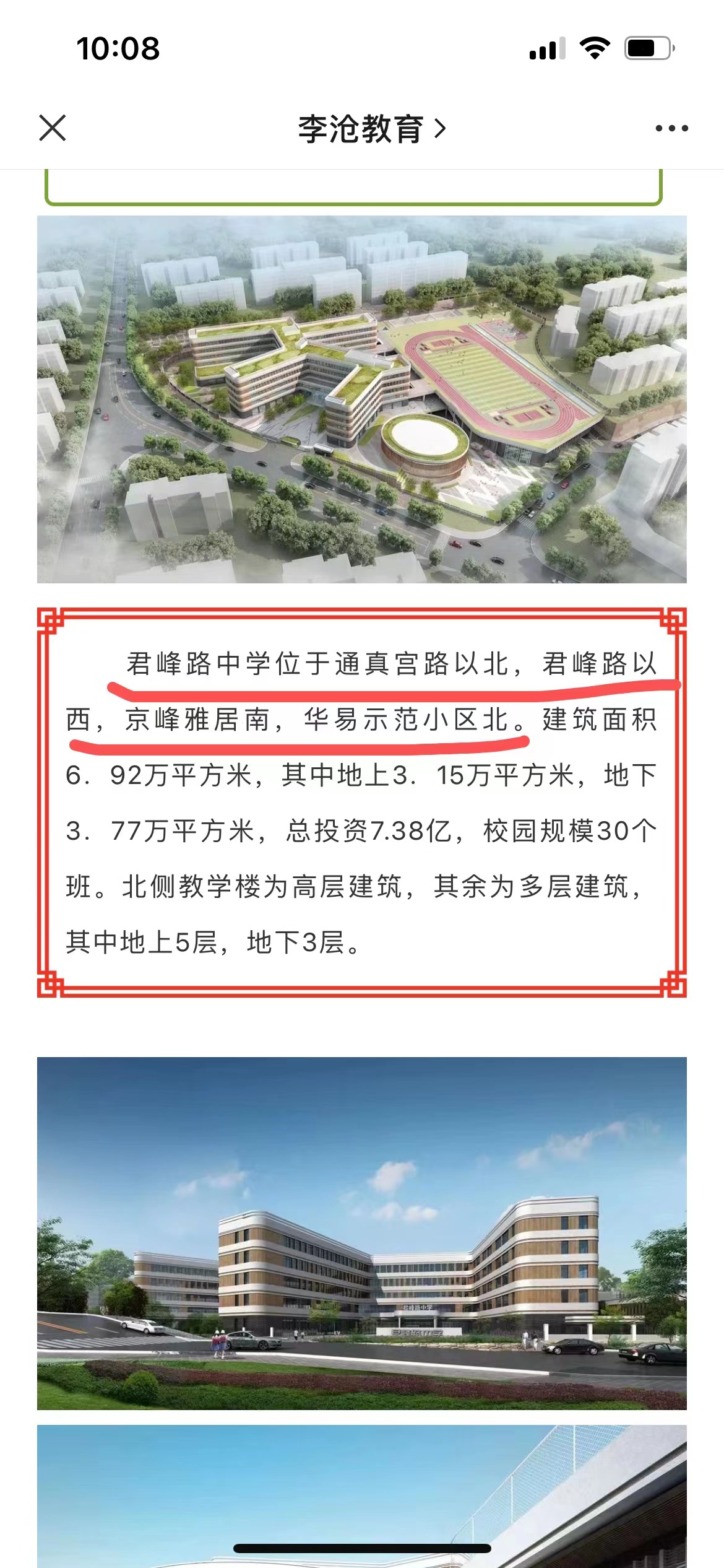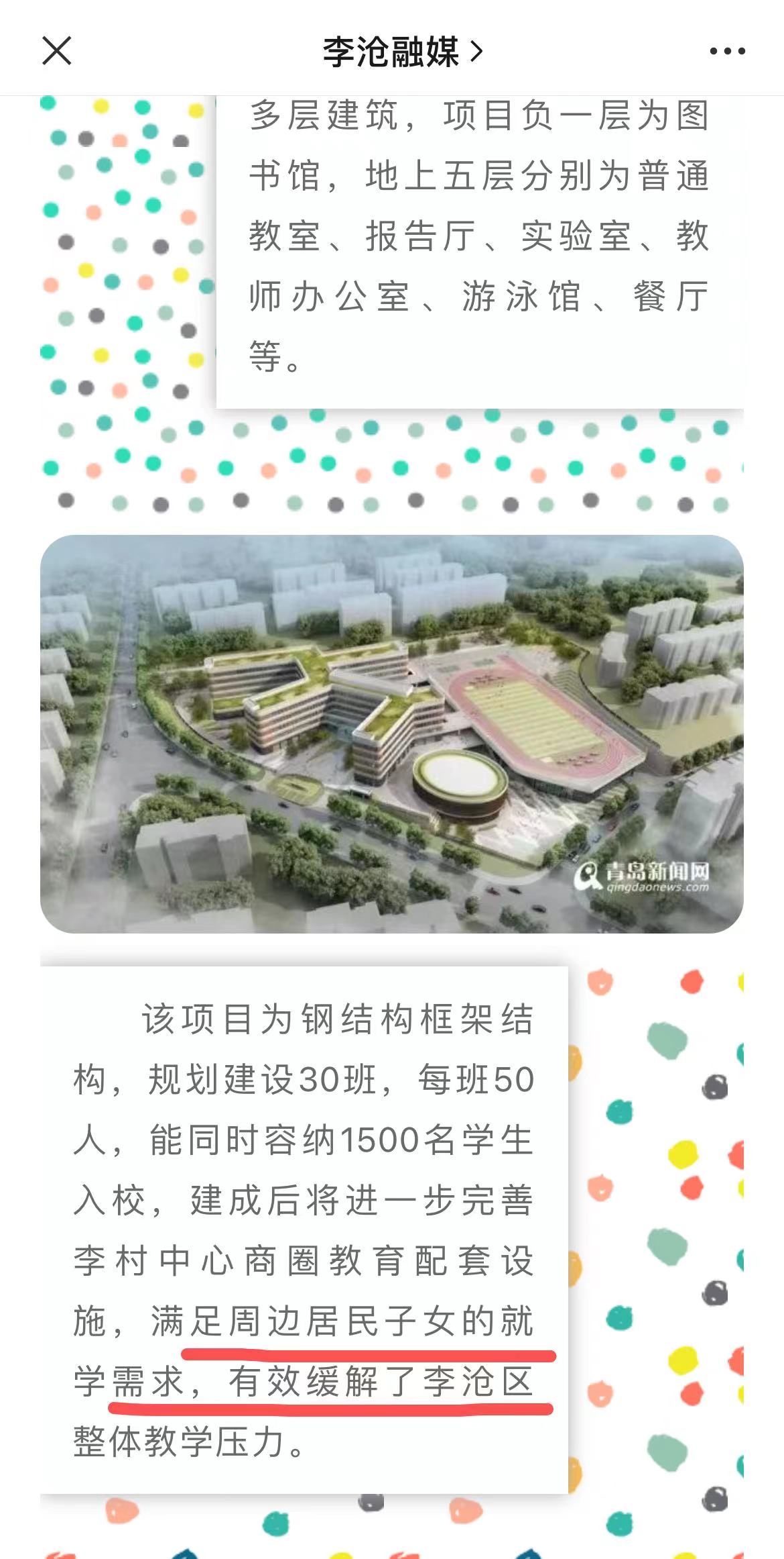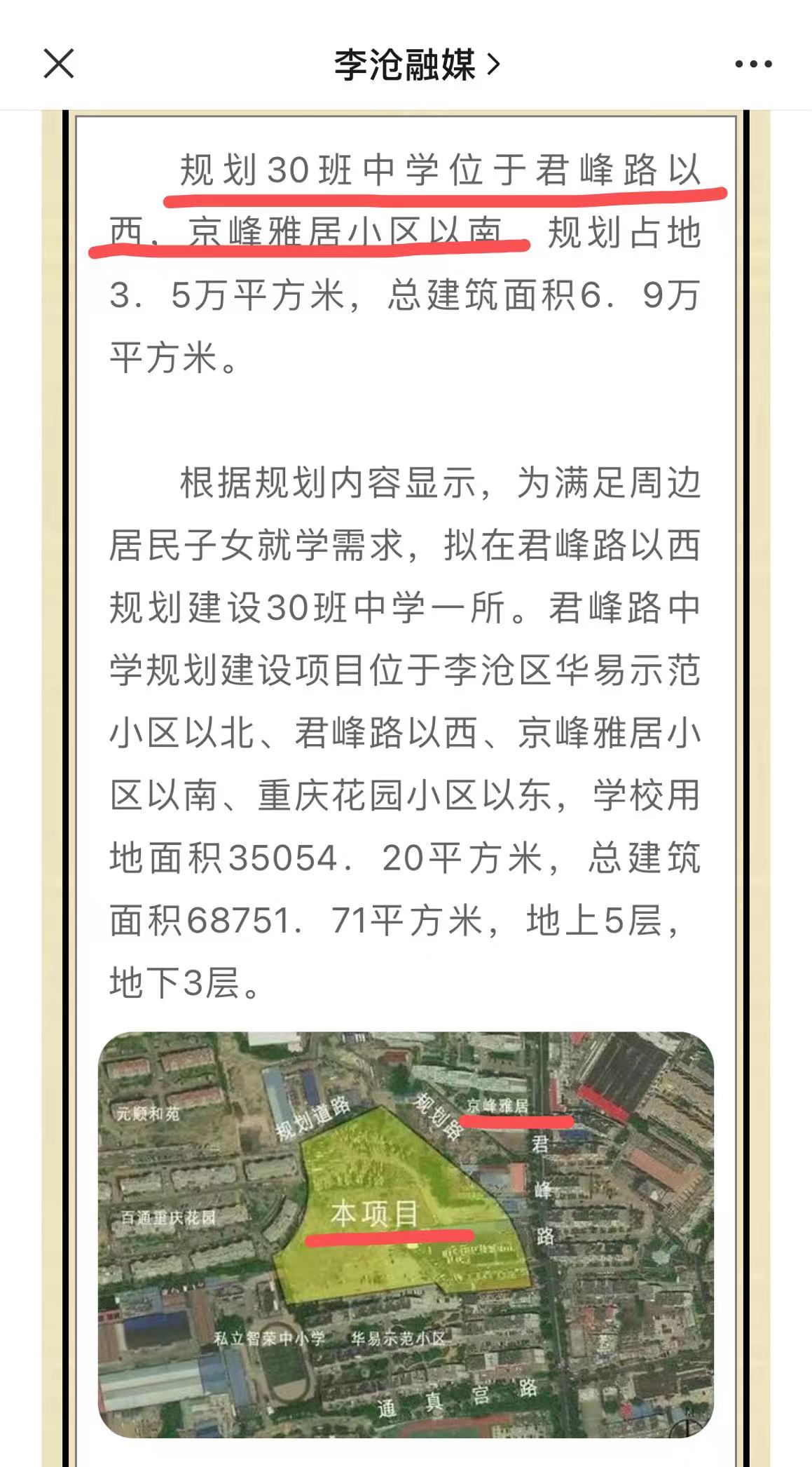 2018年5月,在君峰路中学动工时,李沧区的官方微信公众号“李沧融媒”就发布过关于这一学校的信息,在描述学校位置时写的就是“京峰雅居小区以南”,就连规划公示的图片上都标记了京峰雅居小区的位置。同时,在这篇文章中还写到“此次规划建设的君峰路中学建成后,将进一步完善李村中心商圈教育配套设施,满足周边居民子女的就学需求。”而李沧教体局的官方微信公众号“李沧教育”在介绍君峰路中学项目时,也使用了“京峰雅居南”这一说法表示位置。