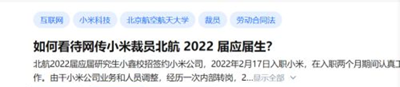 在#小米裁员北航22届应届生#以及#北航应届生自爆被小米裁员#等微博话题中,大量网友声援该毕业生。有网友谴责小米“先是招到好的项目组,入职一个月后调岗,调岗一个月后告诉你项目组不行要裁员。这不是把人骗进来再杀吗。裁应届生真的不道德。”还有网友质疑小米,“招人的时候就没点规划?”