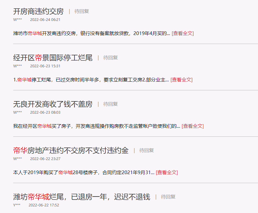 帝华城项目由潍坊帝华房地产开发有限公司开发,产权70年。公开资料显示,该项目开盘时间是2019年08月03日,交房时间是2020年下半年。然而至今没有交房,被业主投诉烂尾。