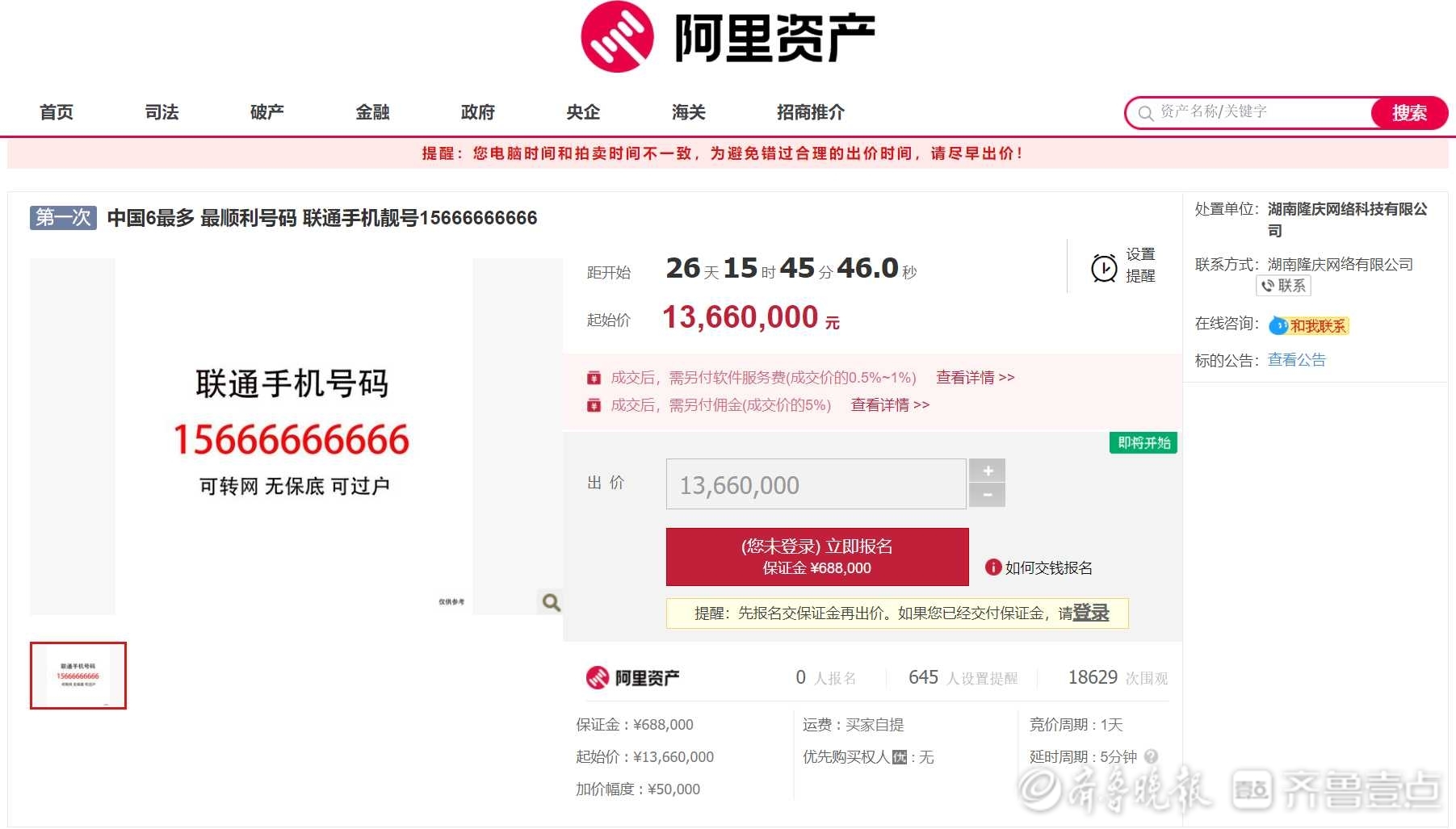 打开一条史上“最6”手机号的拍卖信息今天引发关注。近日,阿里资产网站上线了一个手机号拍卖品,为联通手机靓号15666666666,起拍价1366万元,保证金68.8万元,加价幅度为5万元或整倍数。此次拍卖将于10月10日10时开始。记者看到,截至9月13日18:00,该拍品已有18629次围观,645人设置提醒,但目前无人报名。
