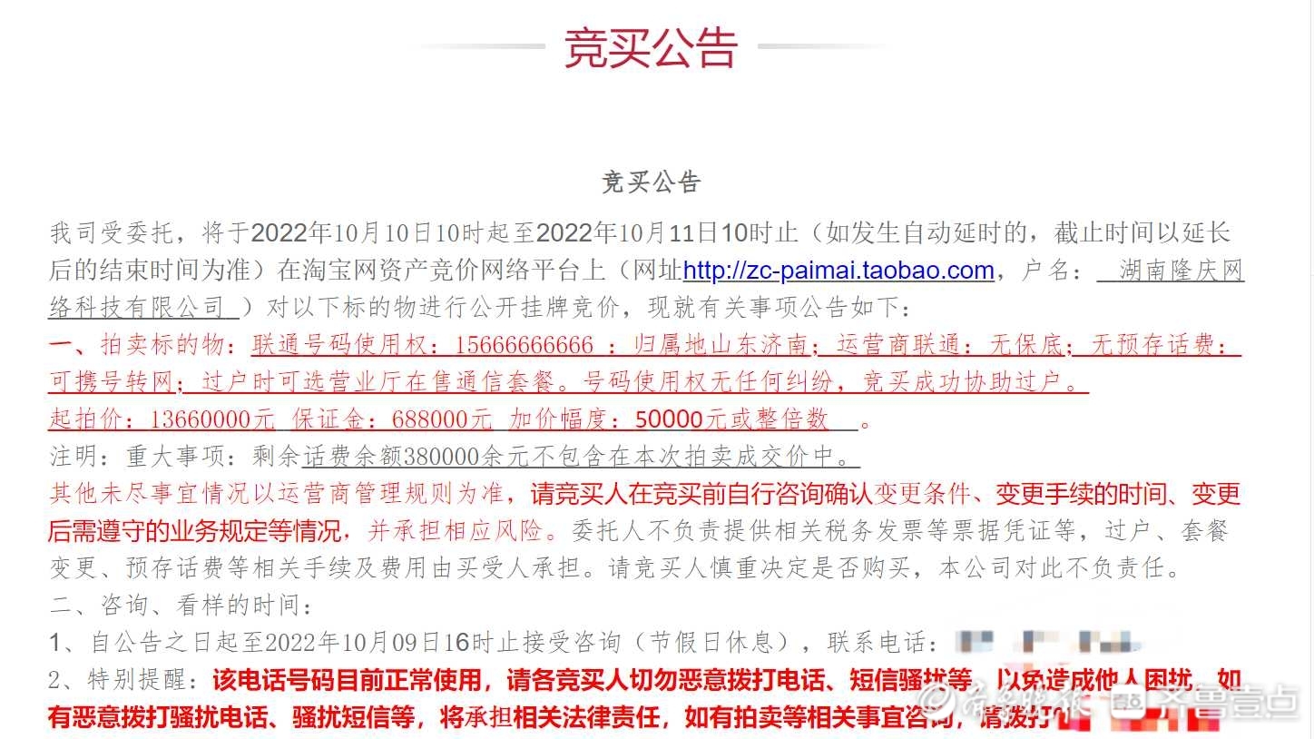 此外,公告注明重大事项:该手机号剩余话费余额38万余元不包含在本次拍卖成交价中。