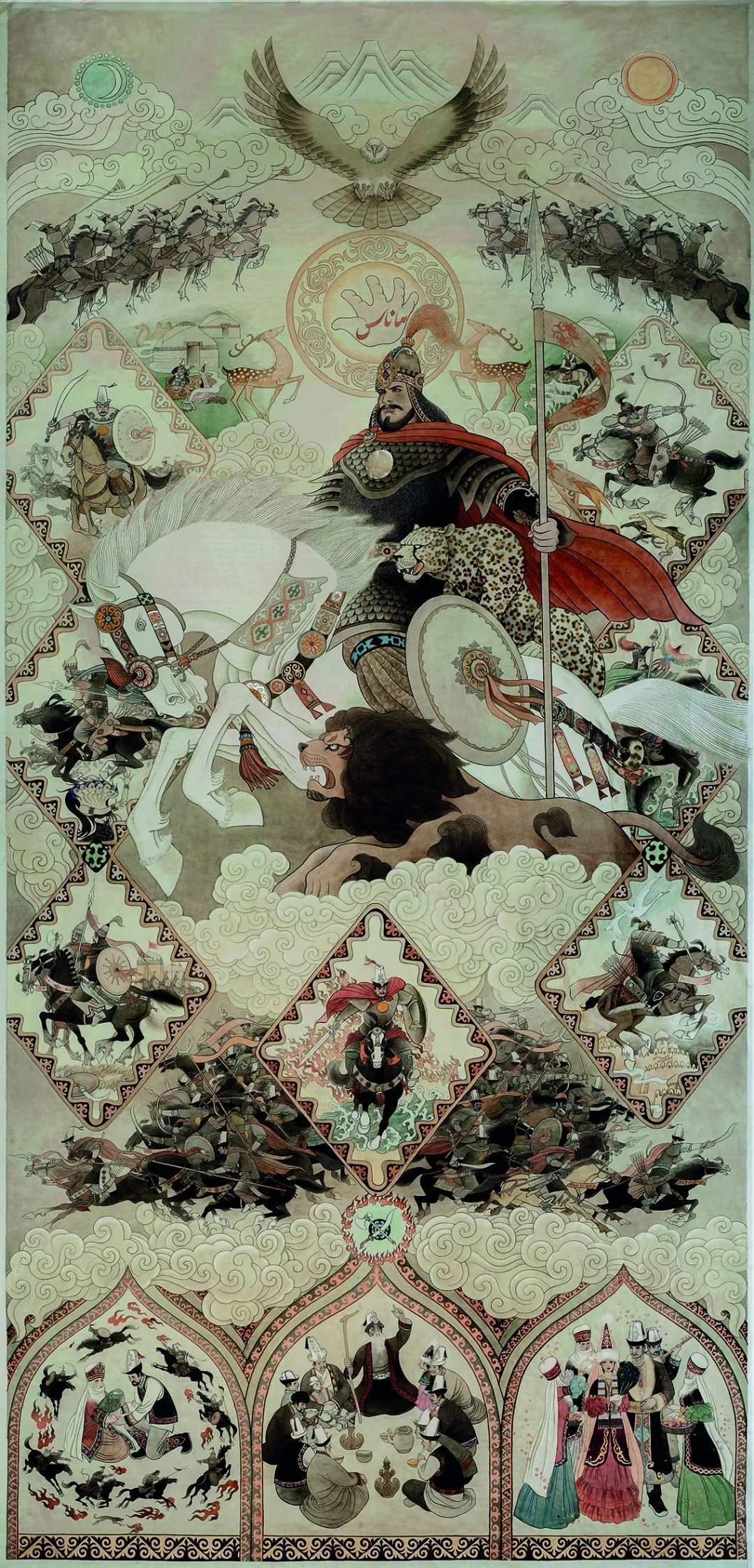 中国画《英雄史诗——玛纳斯》取材自我国三大史诗之一的《玛纳斯》,热情讴歌了英雄玛纳斯及其七代子孙前仆后继,率领柯尔克孜人民与外来侵略者、各种邪恶势力进行斗争的事迹,体现了柯尔克孜民族英勇善战、百折不挠的民族精神与民族性格。该部史诗在人物造型、情节安排、语言艺术上,创见颇多,具有浓郁的民族特色。史诗中的丰富联想和生动比喻,均与柯尔克孜人民独特的生活方式、风俗习惯和自然环境紧密相联。